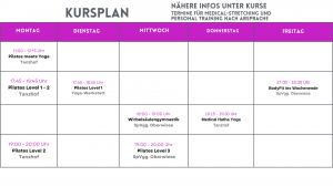 Aerobic, DoBAR (Barre Workout), Entspannungstraining, Medical Stretching, Nordic Walking, Pilates, Präventivtraining, Rehabilitationssport, Rückenschule, Step-Aerobic, Wirbelsäulengymnastik, Walking, Yoga